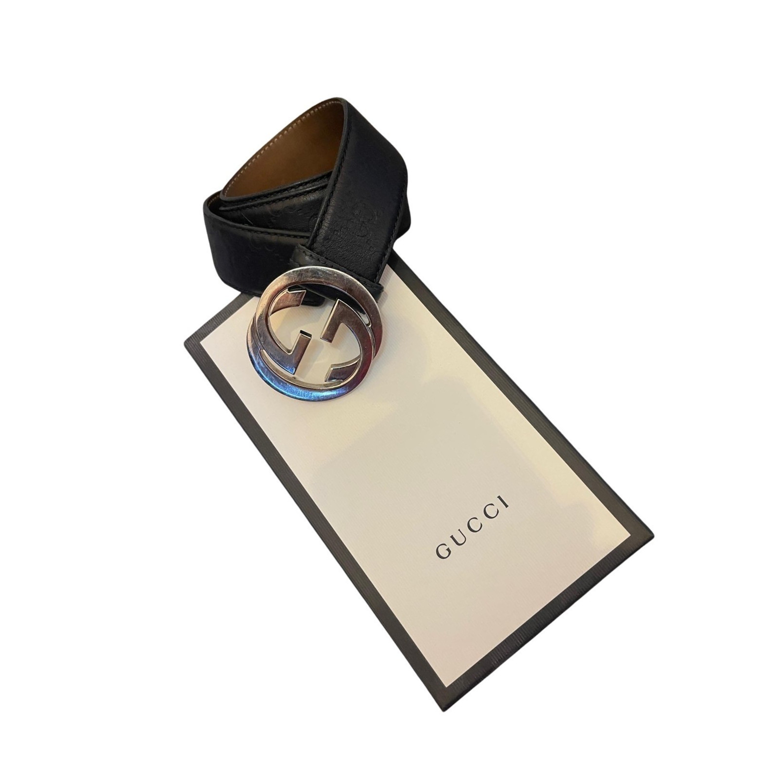 GUCCI GG Gürtel aus schwarzem Leder mit Logo Prägung & silberfarbener Hardware. Grösse der GG Schnalle Breite 5.3 cm Höhe 4.8 cm. Breite 3.8cm. Gürtelgrösse 85. In gutem Zustand.