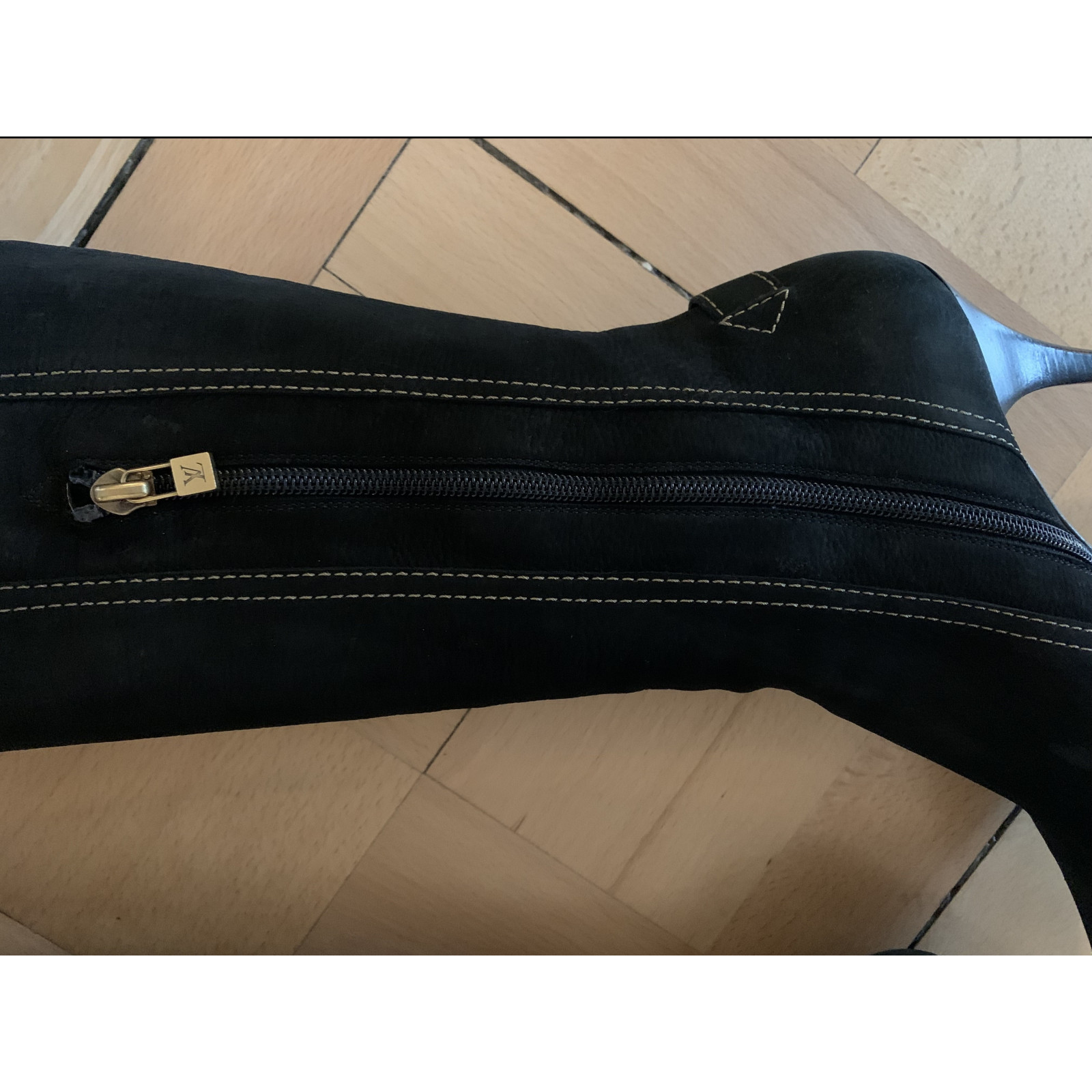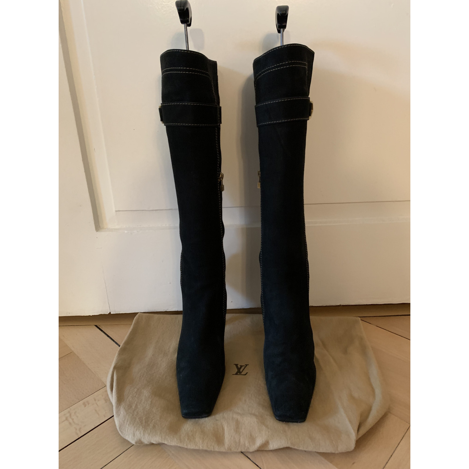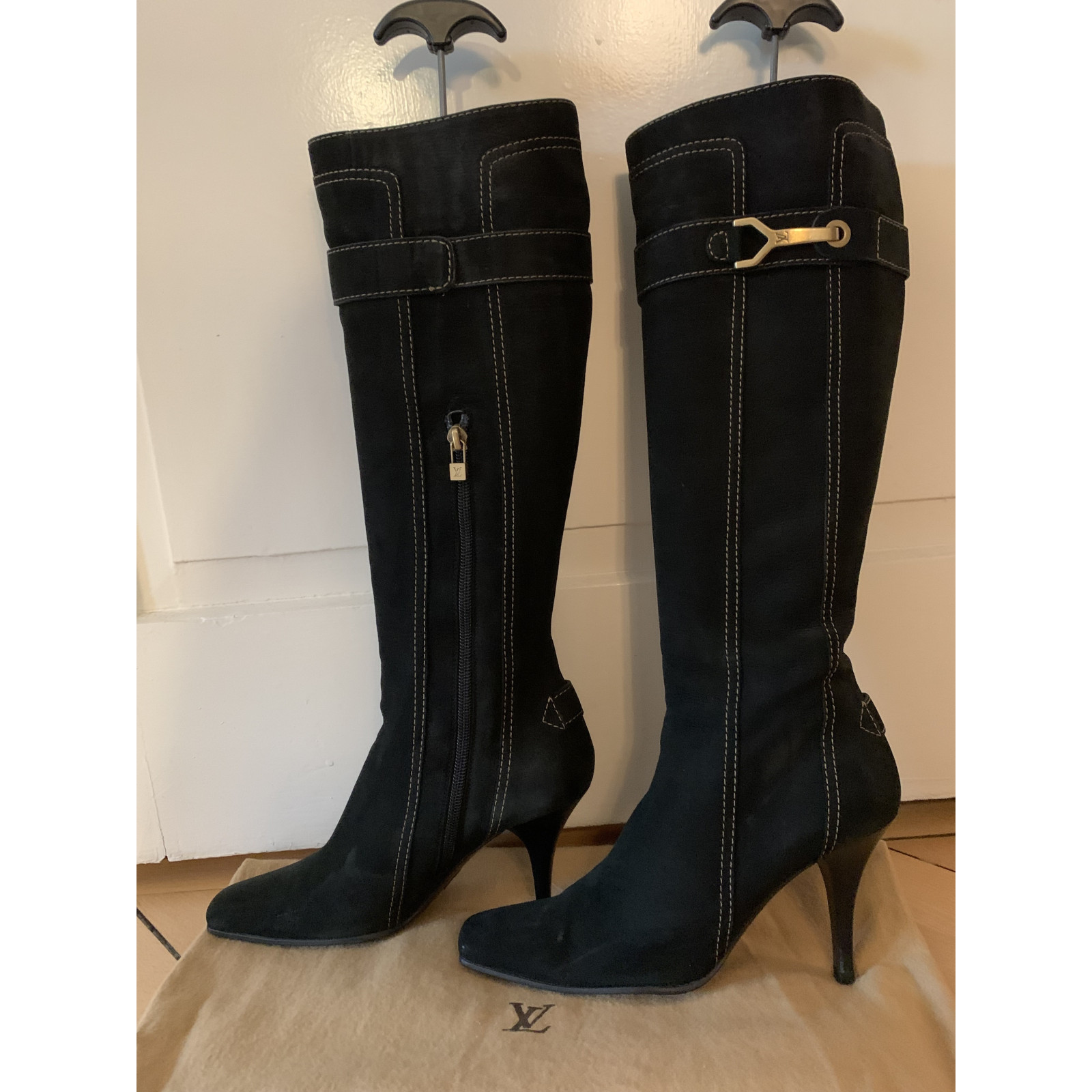 Wunderschöne Stiefel von LOUIS VUITTON by Marc Jacobs in schwarzem Wildleder mit LV-Logo Schnalle in gebürstetem Messing und Reissverschluss. Absatz 9cm. In sehr gutem, gepfegten Zustand (wenig getragen!), mit LV Dustbag.