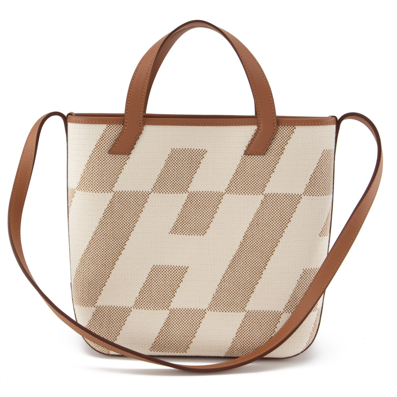 in cremefarbenem & camelbraunem Canvas mit diagonalen "H en Biais" Muster und camelfarbenem Swift-Leder.