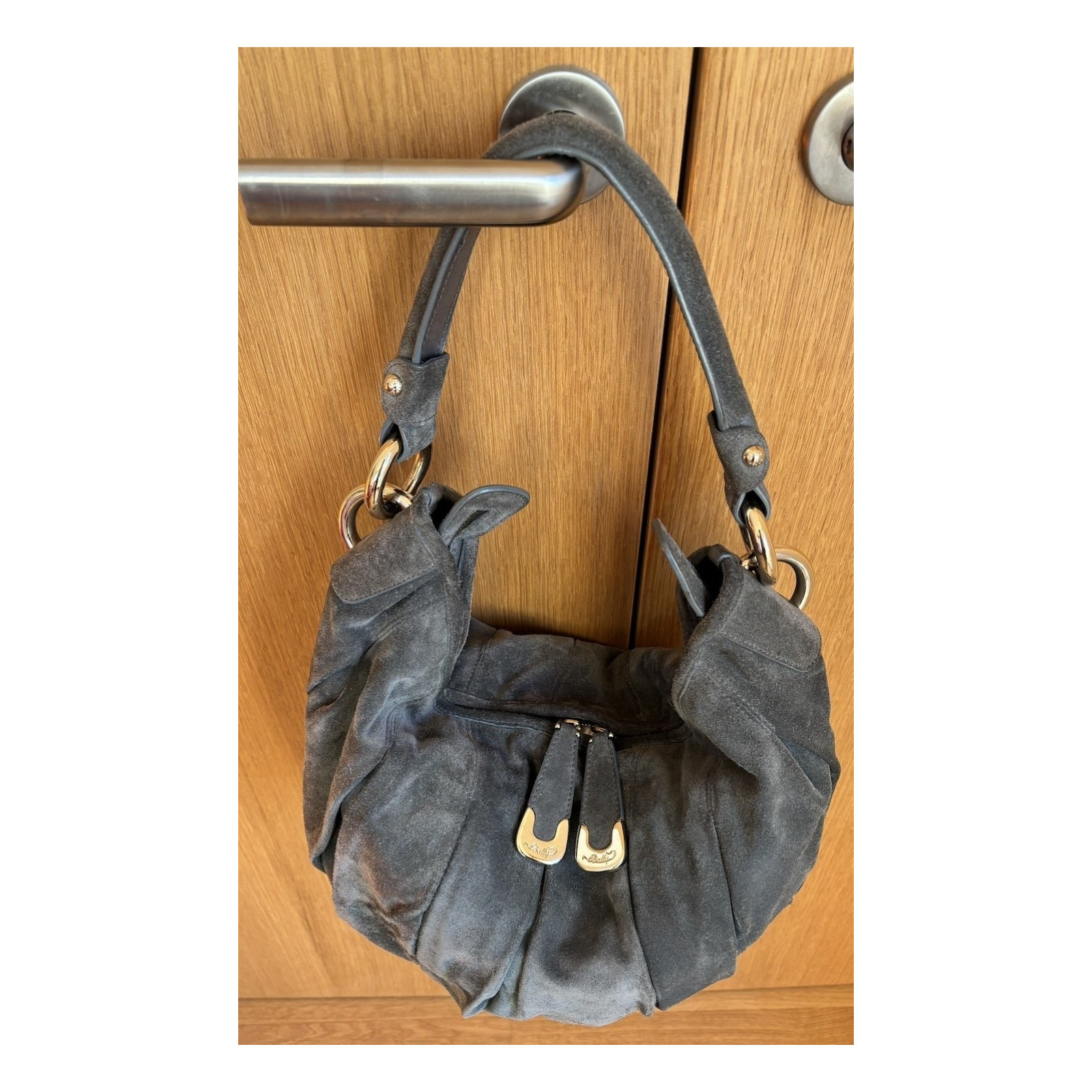 Bally Schultertasche aus grauem Wildleder. In sehr gutem Zustand, da kaum getragen. Reissverschlüsse funktionieren einwandfrei. 45 x 34 cm wenn flach. Kommt mit Bally Staubbeutel.
