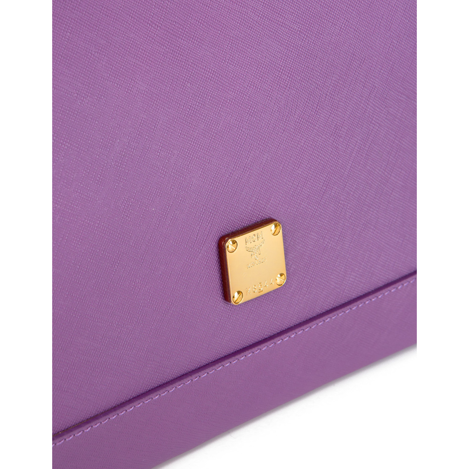 aus violettem Saffiano Kalbsleder und glänzender goldfarbener Hardware.