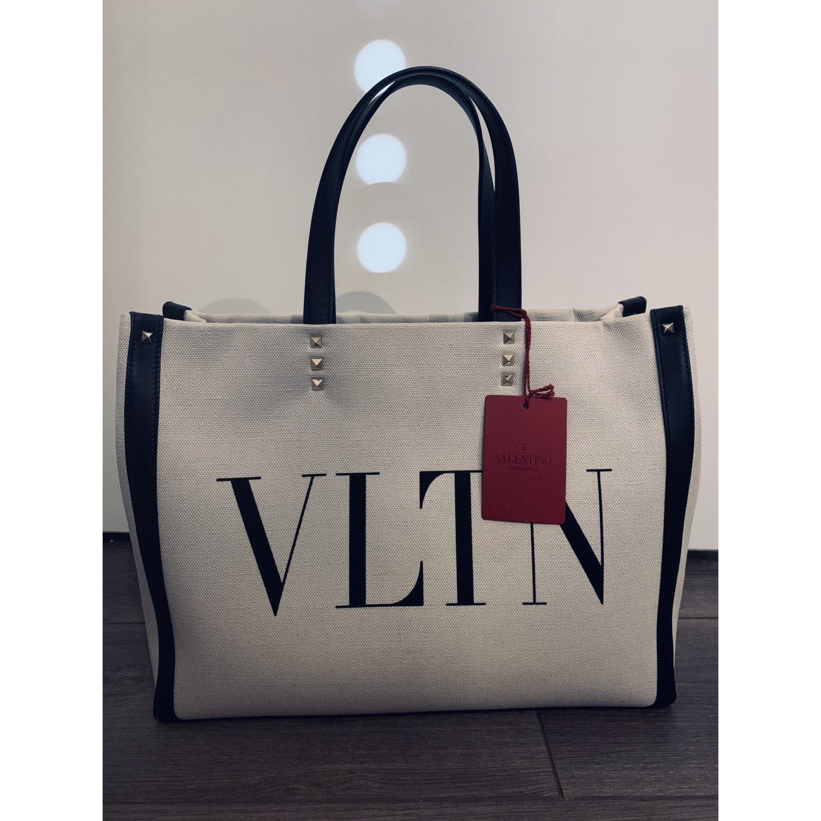 VALENTINO GARAVANI linen shopper with "VLTN" print and leather details. - Studs and metal details with platinum finish - Dimensions - W 37 x H 28 x D 14 cm - Made in Italy. New and unworn, purchased from Fartfech almost two months ago and unfortunately cannot be returned. Comes with dust bag and receipt.