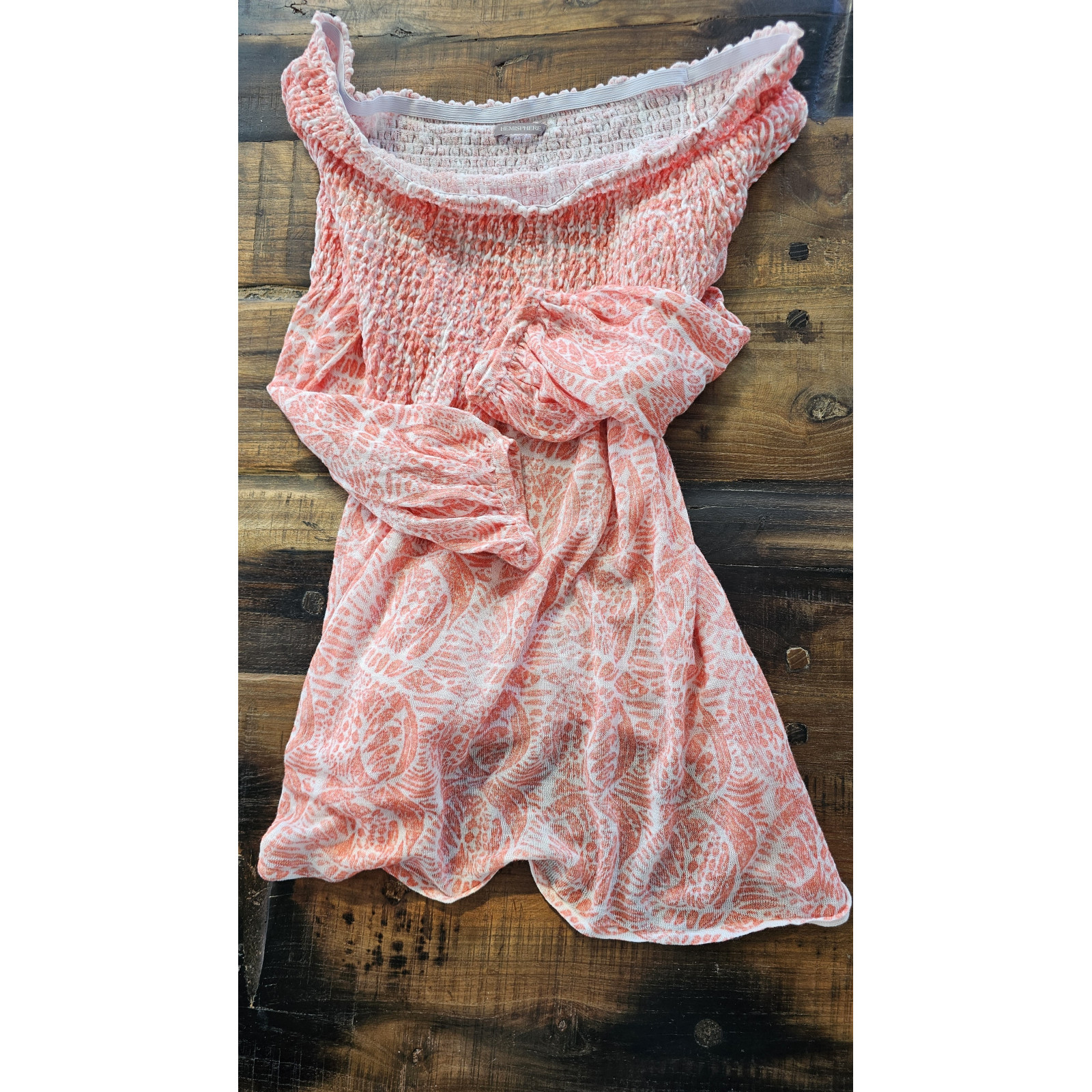 Blouse décolleté "bateau", some 3/4, haut du corps smocké, color abricot et blanc, neuf et taille 40, oversize for a 38 100% lin