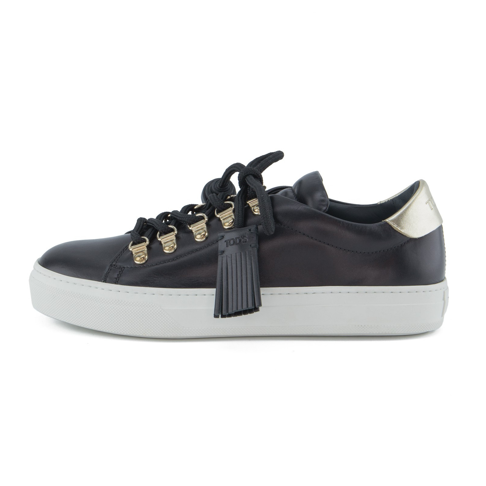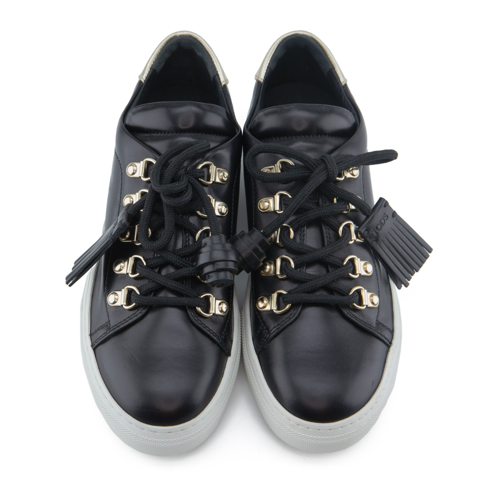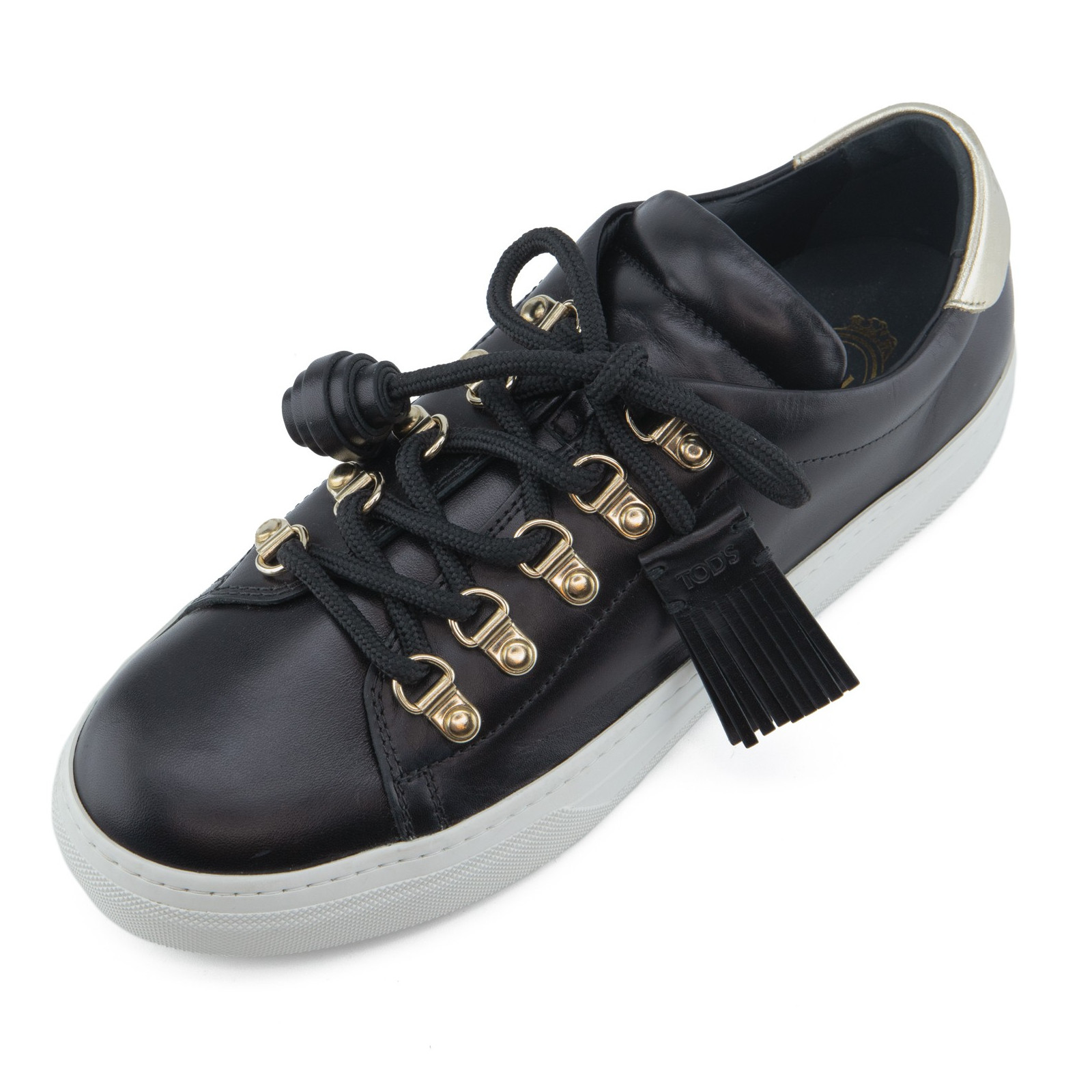 TOD`S Tassel Sneakers in black leather with gold-tone hardware.